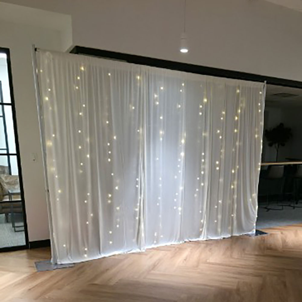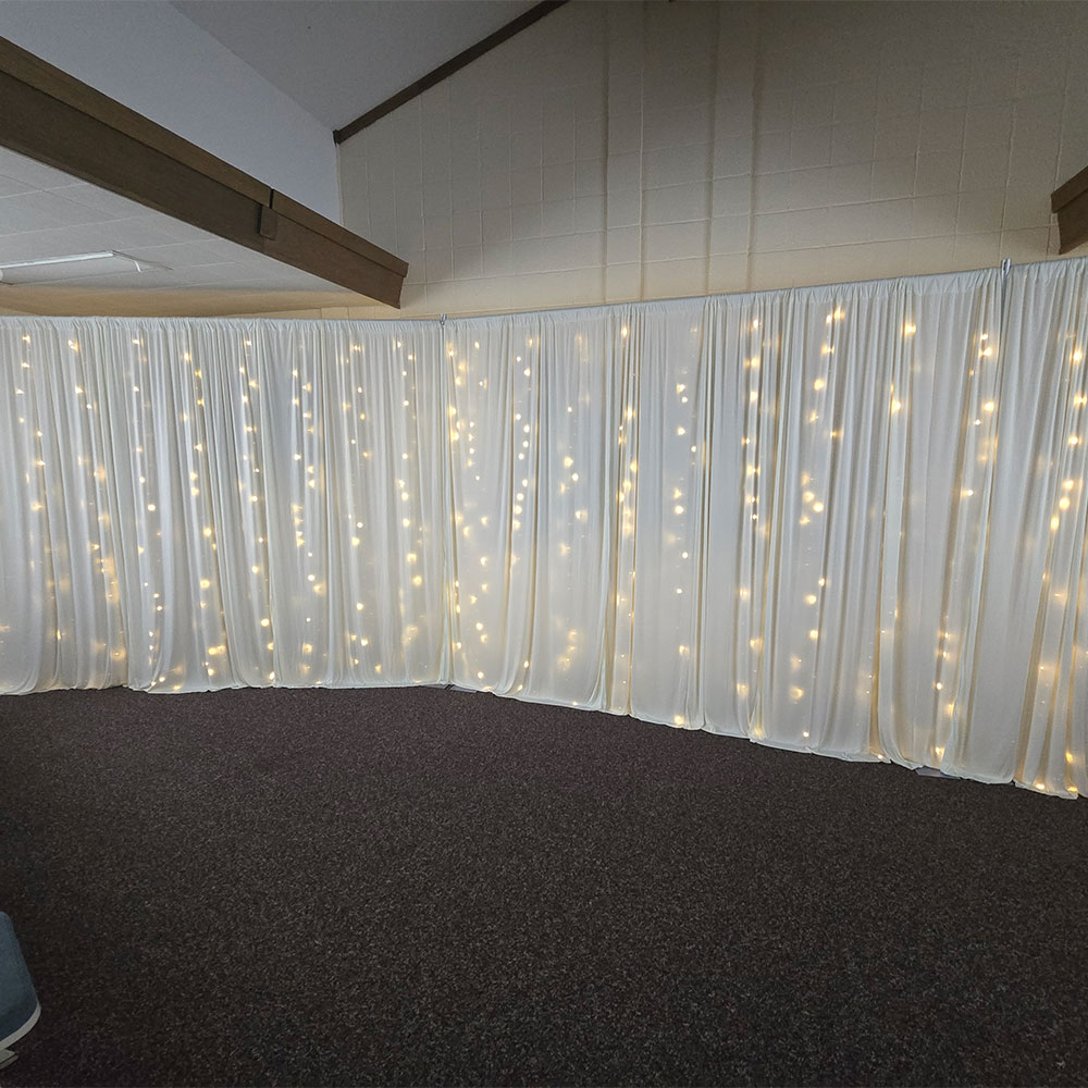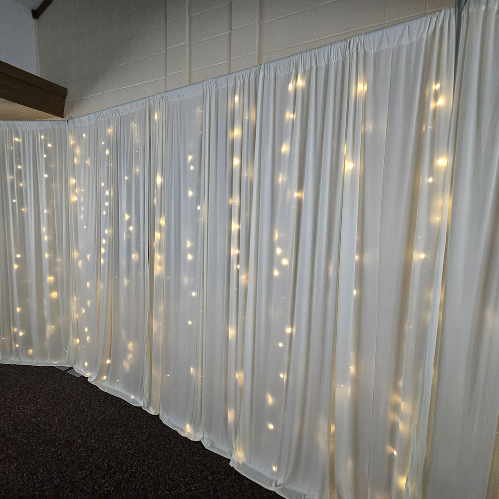 Our fairy lights are designed to integrate seamlessly with our pipe and drape setup. Whether you want a subtle twinkle behind sheer draping or a brighter illuminated backdrop for photos, these lights create a stunning visual effect that elevates any space. Installation is fast and secure, and our team ensures the lights are evenly layered and safely powered for your event.